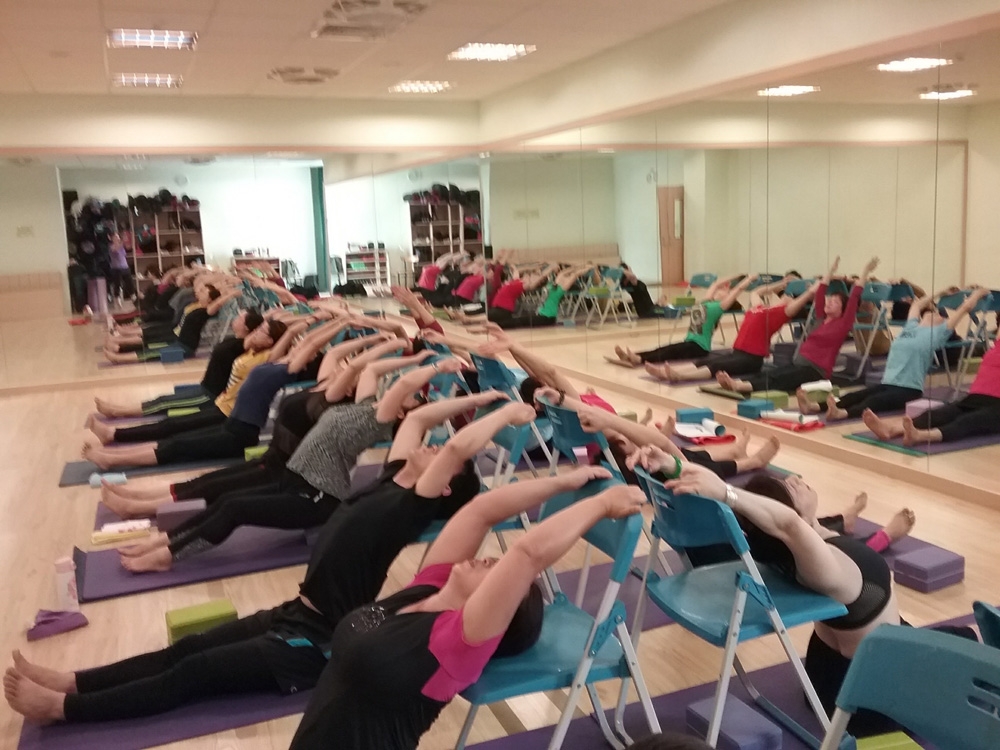 曾麗雪 老師 帶領著大家一起做Health Yoga養生瑜伽-椅子瑜伽,有趣有可以養身,工具也是一般我們常見的椅子,學員們努力一起將姿勢與動作做到到位,達到養身健體的好處喔~~
